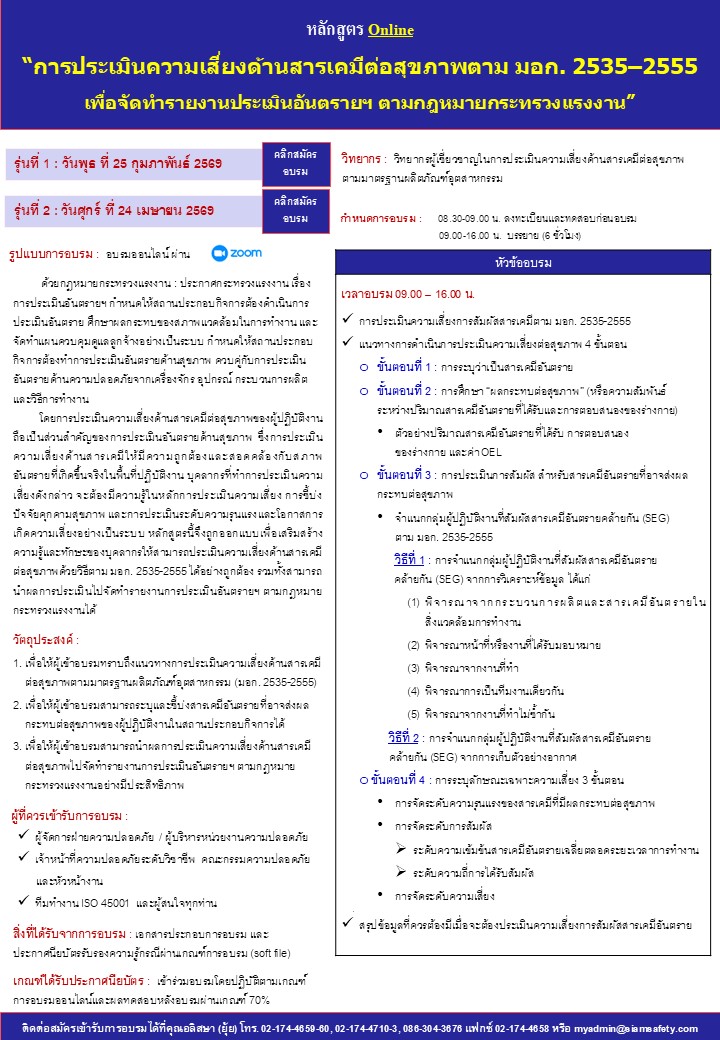 โดยการประเมินความเสี่ยงด้านสารเคมีต่อสุขภาพของผู้ปฏิบัติงานถือเป็นส่วนสำคัญของการประเมินอันตรายด้านสุขภาพ ซึ่งการประเมินความเสี่ยงด้านสารเคมีให้มีความถูกต้องและสอดคล้องกับสภาพอันตรายที่เกิดขึ้นจริงในพื้นที่ปฏิบัติงาน บุคลากรที่ทำการประเมินความเสี่ยงดังกล่าว จะต้องมีความรู้ในหลักการประเมินความเสี่ยง การชี้บ่งปัจจัยคุกคามสุขภาพ และการประเมินระดับความรุนแรงและโอกาสการเกิดความเสี่ยงอย่างเป็นระบบ หลักสูตรนี้จึงถูกออกแบบเพื่อเสริมสร้างความรู้และทักษะของบุคลากรให้สามารถประเมินความเสี่ยงด้านสารเคมีต่อสุขภาพด้วยวิธีตาม มอก. 2535-2555 ได้อย่างถูกต้อง รวมทั้งสามารถนำผลการประเมินไปจัดทำรายงานการประเมินอันตรายฯ ตามกฎหมายกระทรวงแรงงานได้