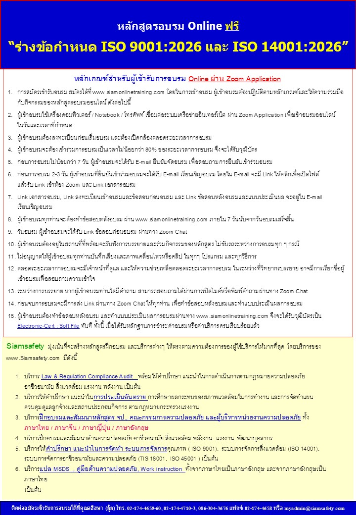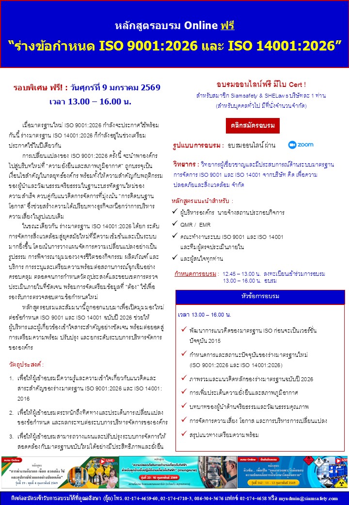 หลักสูตรอบรมและสัมมนานี้ถูกออกแบบมาเพื่อเปิดมุมมองใหม่ต่อข้อกำหนด ISO 9001 และ ISO 14001 ฉบับปี 2026 ช่วยให้ผู้บริหารและผู้เกี่ยวข้องเข้าใจสาระสำคัญอย่างชัดเจน พร้อมต่อยอดสู่การเตรียมความพร้อม ปรับปรุง และยกระดับระบบการบริหารจัดการขององค์กร