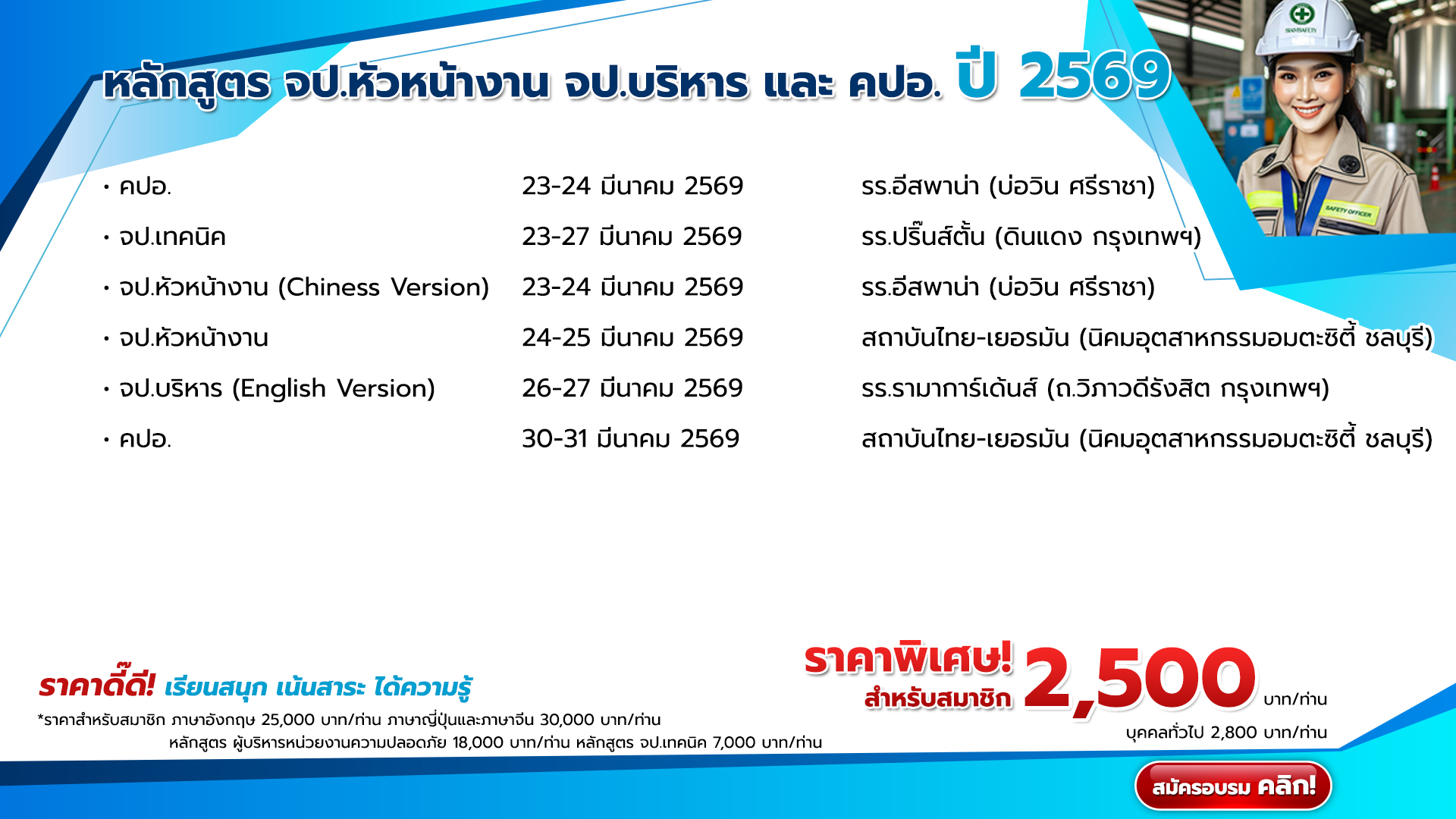 ท่านสามารถเข้าดูแผนการจัดอบรมปี 2568 ทั้งหมด หรือสนใจสมัครเข้ารับอบรมหลักสูตรต่างๆ ของ Siamsafety ได้ที่ https://pb.siamonlinetraining.com/
