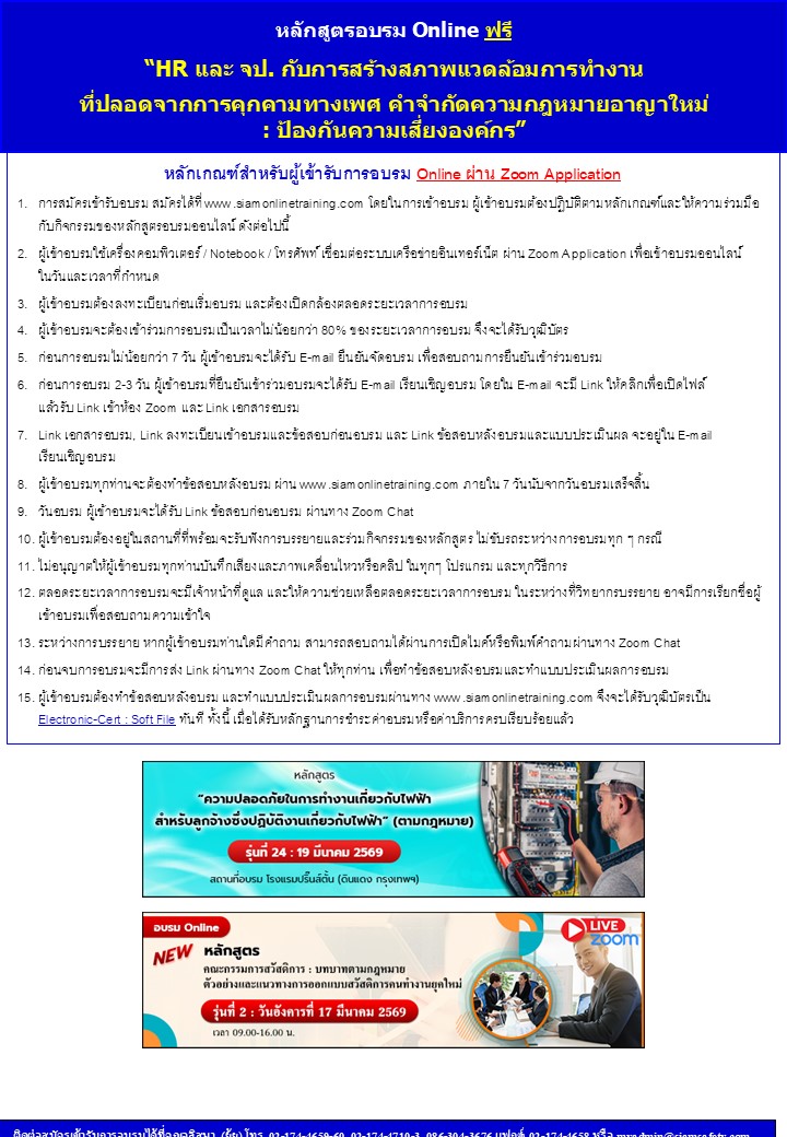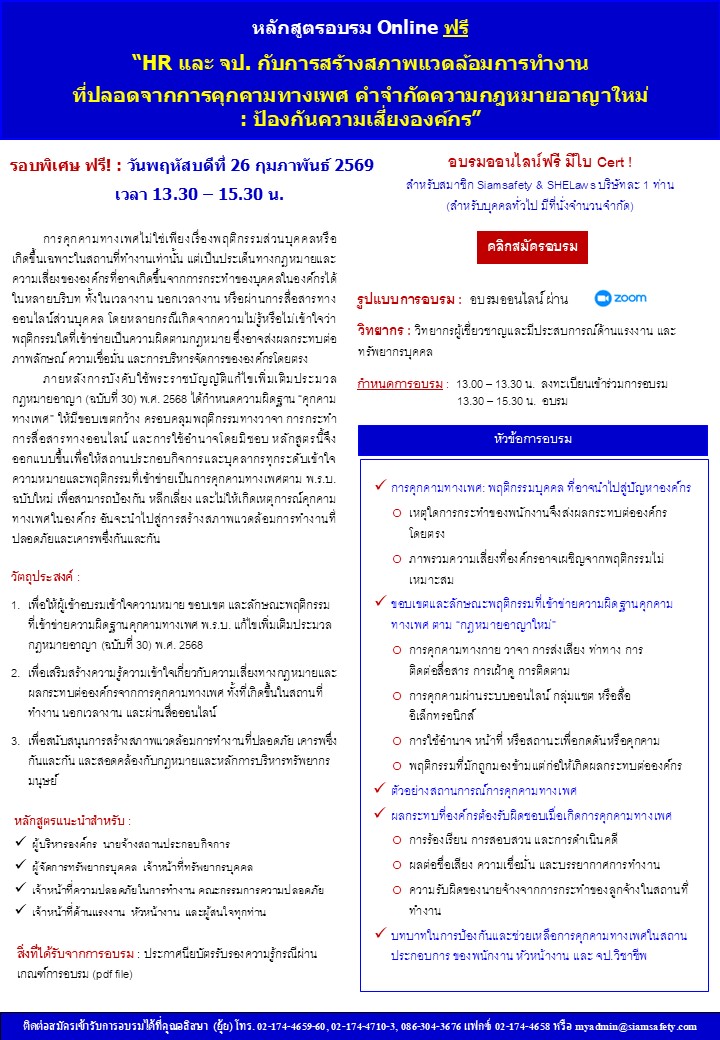 “HR และ จป. กับการสร้างสภาพแวดล้อมการทำงาน ที่ปลอดจากการคุกคามทางเพศ คำจำกัดความกฎหมายอาญาใหม่ : ป้องกันความเสี่ยงองค์กร”